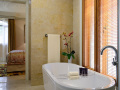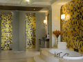 просторная ванная комната с глубокой ванной, душевой кабиной с ливневым душем, двумя раковинами;