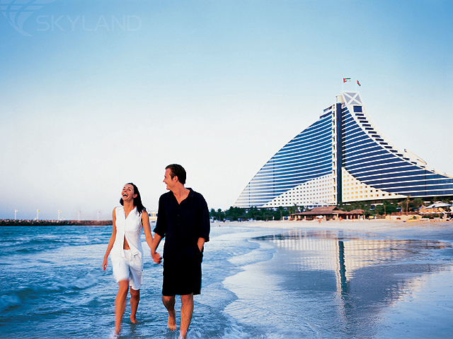 Jumeirah Beach Hotel – признанный символ Дубая, набегающая на прославленный пляж Джумейра гигантская "волна" роскоши, комфорта и престижа. В дизайне и декоре отеля использованы элементы лучших арабских традиций. Цветовая гамма, выбранная для декора отеля, символизирует 4 природные стихии: синий и зеленый, красный и коричневый, голубой, ярко-алый и желтый. Эти тона присутствуют во всем убранстве отеля. Наиболее четко эта задумка видна в дизайне атриума лобби, где находится скульптурная композиция высотой 90 метров. Она символизирует представление арабов о Вселенной и месте Земли и Аравийского полуострова в этом глобальном пространстве. Недалеко от отеля расположен известный развлекательный аквапарк Wild Wadi Water Park - место отдыха не только для детей, но и для всех взрослых.