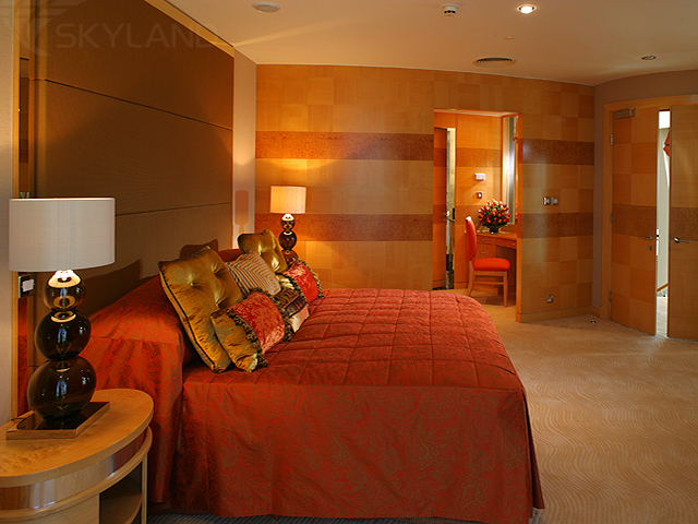 1 Royal Suite (216 кв.м) – роскошный номер с одной спальней с ванной комнатой с ванной и душевой кабиной, холл, просторная гостиная со столовой зоной на 4 персоны, 2 мини-барами и барной стойкой, а также большой солнечной террасой с захватывающим видом на Залив.