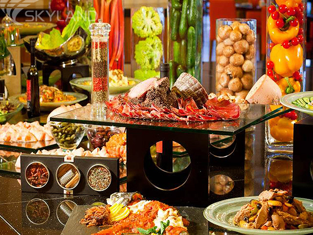 Завтрак в отеле: более шестидесяти различных блюд международной и континентальной кухни по системе «шведский стол» (лучшие фирменные блюда, любимые блюда ближневосточной и европейской кухни, а также блюда, приготовленные в открытых кухнях, свежие соки и фруктовые коктейли) и по меню a la carte. В число кулинарных изысков входит широкий выбор фирменного кофе Mövenpick, а также разнообразные виды кондитерских изделий и хлеба, испеченного на собственной кухне. Завтрак подается семь дней в неделю с 06:30 до 10:30.