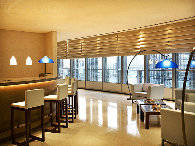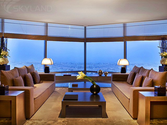 Armani Signature Suite (235 кв.м) - прихожая, гостиная, барная стойка, столовая, кабинет, спальня с кроватью king-size, кладовая, ванная комната с ванной и душевой кабиной, 3 гостевых туалета. Расположены на 38 и 39 этажах. Вид на город, пустыню и Персидский залив.