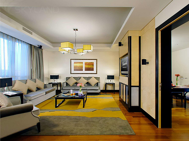 1 Presidential Suite (300 кв.м) - терраса, фойе, гостиная со столовой зоной, кухня, бар, 2 спальни с кроватями king-size, гардеробная, 2 ванные комнаты (в каждой – джакузи и душевая кабина), комната для прислуги с отдельной ванной. Панорамный вид на город.