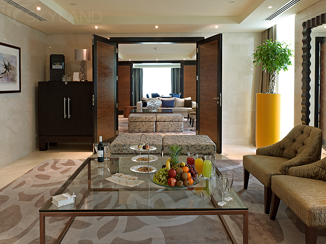 6 Three Bedroom Suites (280–300 кв.м) - прекрасно оборудованные апартаменты предлагают роскошное размещение для больших семей и компаний друзей. В номере: 3 спальни, уютная гостиная с обеденной зоной, просторная терраса площадью от 21 до 31 кв.м с потрясающим видом на Персидский залив, полностью оборудованная кухня, холодильник, высокоскоростной беспроводной и широкополосный доступ в Интернет, набор для приготовления чая и кофе, ЖК телевизоры во всех комнатах. В каждой спальне есть просторная ванная комната с отдельной душевой кабиной, глубокой ванной и косметической продукцией класса люкс. Гостям этих номеров предоставляются услуги в зоне Executive Lounge, а также доступ к частным пляжным павильонам на пляже Suite Beach.