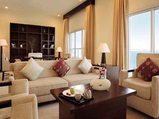 Suites (One, Two, Three Bedrooms) (85 – 199 кв.м) — прекрасно оборудованные номера с одной или 2 террасами и видом на центральный бассейн и Оманский залив. В номерах также: одна, две или 3 спальни, ванные комнаты и отдельная гостиная с обеденной зоной. Максимальное размещение – 7 взрослых.