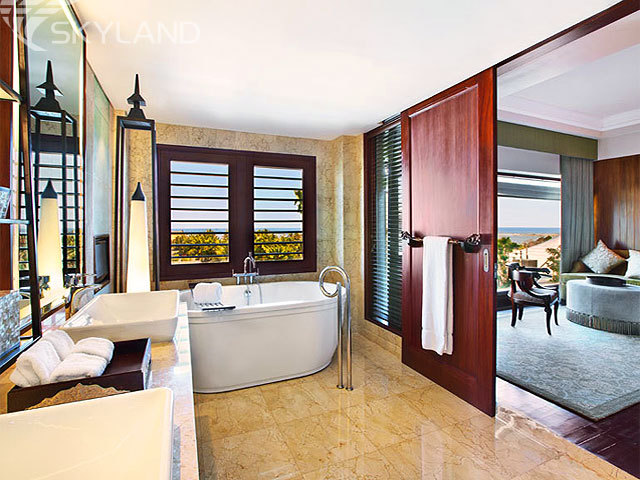 отделанная мрамором ванная комната с большой ванной, стоящей у стеклянной стены, душевой кабиной с функцией «тропический душ», двумя раковинами, феном, телевизором с ЖК экраном (35,5 см), телефоном, двойным туалетным столиком, большим зеркалом и зеркалом для бритья/макияжа, электронными весами;