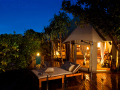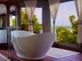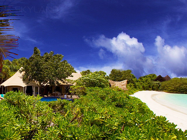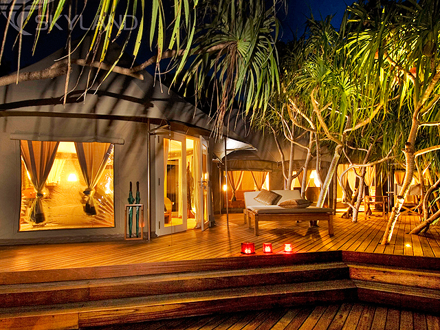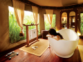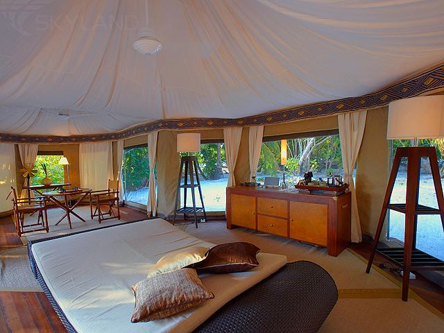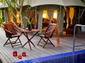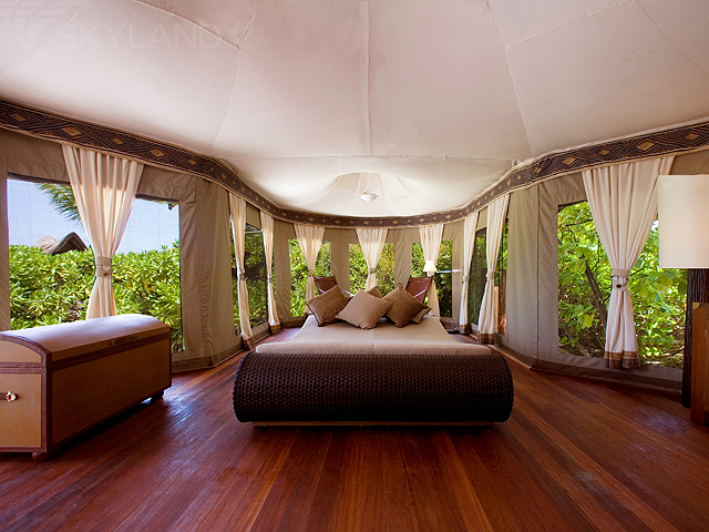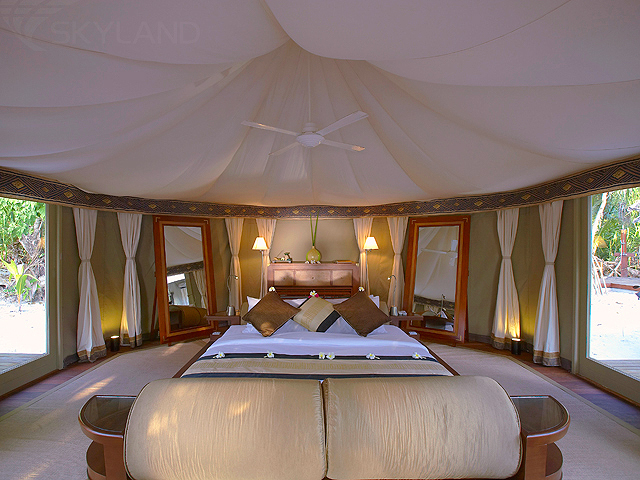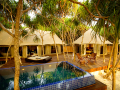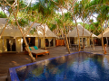 6 Tented Pool Villas (264 кв.м) – элегантно декорированных, роскошно оборудованных вилл класса «люкс». Каждая из вилл – это оазис роскоши, покоя и уединения – райский приют для двоих. Скрытые в гуще тропического леса индивидуальные береговые виллы с большим собственным бассейном, представляют собой комплекс из 3 стоящих на едином деревянном настиле шатров с прозрачными стенами, в которых расположены гостиная, спальня и ванная комната со стоящей по центру дизайнерской ванной, двумя душами под открытым небом и двумя кушетками для проведения сеансов массажа и спа процедур непосредственно на вилле. Виллы декорированы дорогими тканями, обставлены мебелью ручной работы из ротанга и тика, и выдержаны в теплых коричневых и бежевых тонах. Полы в виллах изготовлены из твердых пород древесины.