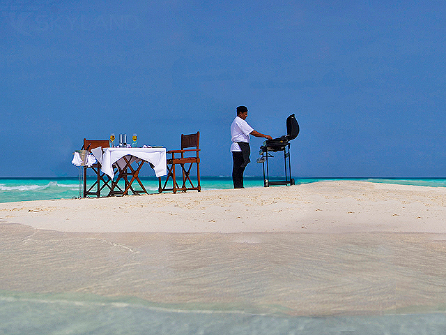 Sandbank Dining – Ваш персональный дворецкий и шеф-повар ресторана сервируют для гостей виллы романтический завтрак, обед, или ужин на безлюдном белоснежном пляже острова, или на пляже необитаемого острова, у самой кромки воды.