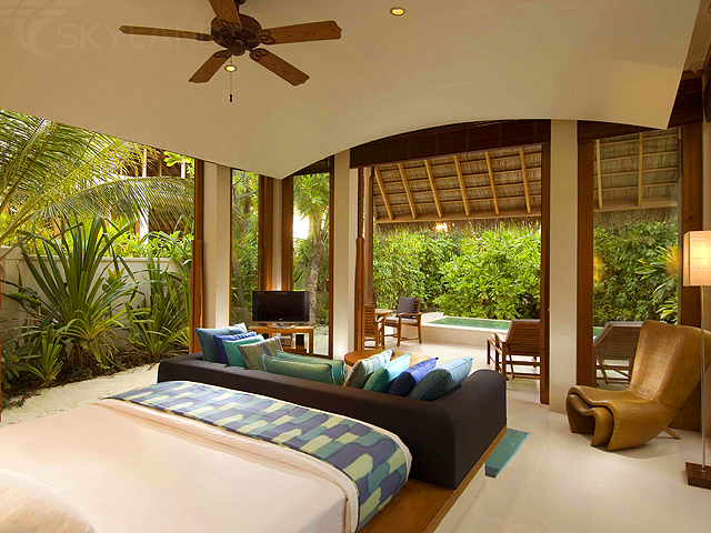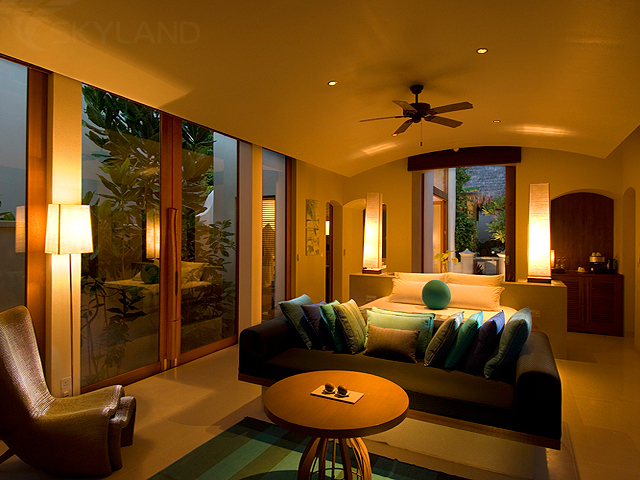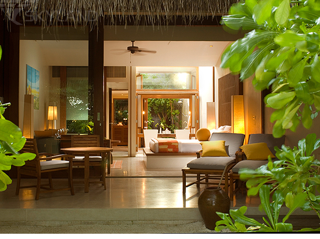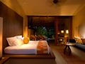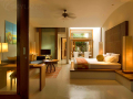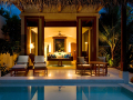 44 Deluxe Beach Villas (300 кв.м) – просторные отдельные виллы на пляже с роскошной мебелью, со спальней со стеклянной раздвижной стеной, террасой-солярием с лежаками, приватным двориком с фонтаном, огромной ванной комнатой с ванной под навесом из тростника, душем под открытым небом и небольшим бассейном в частном саду.