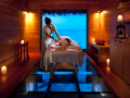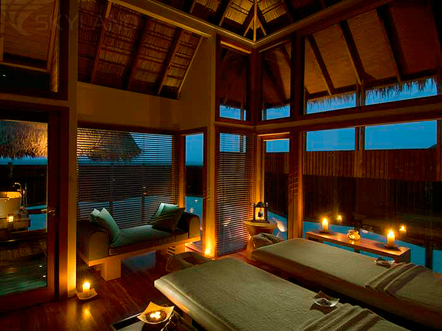 На виллах: 2 солярия с лежаками и спуском в воды лагуны, кабинет для массажа с 2 кушетками, ванна и душ ливневого типа на свежем воздухе. Гости Spa Water Villas принимают процедуры спа и массажа непосредственно на вилле, здесь для них ежедневно - соки и свежие фрукты.