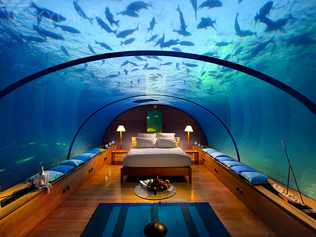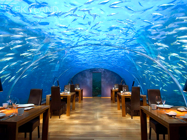 Ithaa Undersea Restaurant – удивительный первый в мире подводный ресторан-аквариум на глубине 5 м., сквозь прозрачные стены которого можно любоваться красотами кораллового рифа и проплывающими мимо обитателями лагуны. Его меню составляют блюда европейской и современной мальдивской кухни, а к ним подают только шампанское!
