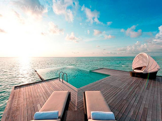 2 Sunset Water Villas (250 кв.м) – построенные в 2001 г. в уединенной части лагуны в 100 м. от берега роскошные отдельные виллы открытого плана на сваях. На виллах: 2 спальни (в центре одной из них круглая вращающаяся кровать) с телевизионными плазменными панелями и DVD проигрывателями в обеих, гостиная с прозрачным полом, CD проигрывателем и аудио системой объемного звучания Bose, кухня, 2 ванные комнаты с видом на океан и отдельным душем Pharo, терраса-солярий с лежаками, джакузи и спуском в воды лагуны, подсвечиваемый индивидуальный бассейн с морской водой. К услугам гостей на вилле: персональный дворецкий и личный катер.