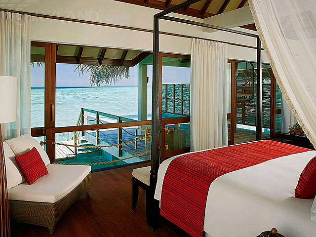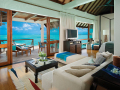 2 Two-bedroom Water Villas (310 кв.м) - водные виллы с панорамным видом на океан стоят на сваях над водой на северо-западе острова в конце понтонного мостика и состоят из 2 спален, 2 ванных комнат, гостиной, обеденной зоны, 3 душевых кабин под открытым небом и прямым спуском в лагуну, открытой террасы (890 кв.м) с бассейном, солярием, зоной отдыха.