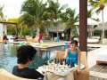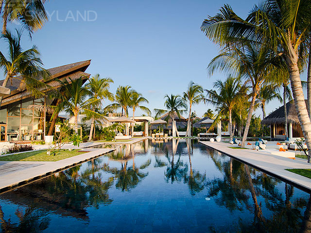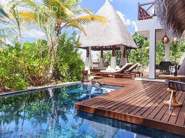 индивидуальный бассейн (L-образной формы площадью 49 кв.м – в береговых виллах, и площадью 17 кв.м – в водных виллах), с террасой-солярием с павильоном для отдыха и столовой зоной;