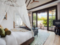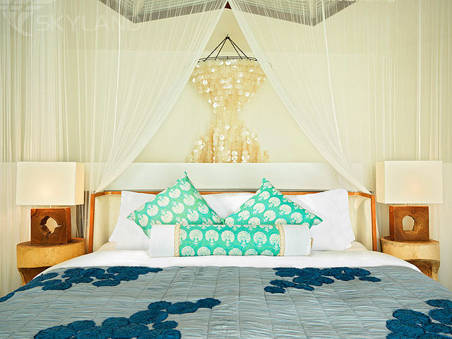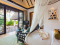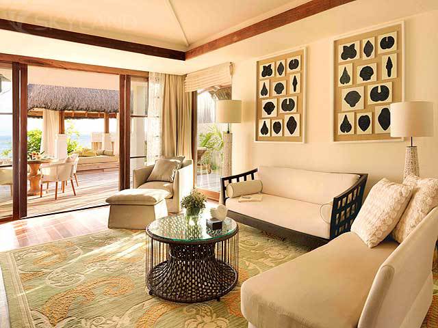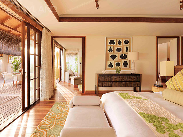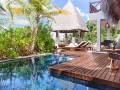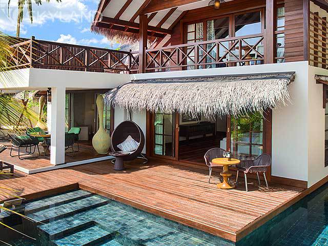 Two Bedroom Beach Suites with Pool (302 кв.м) - разместившиеся в окружении тропического сада двухэтажные береговые виллы с двумя спальнями, видом на Индийский океан и выходом к собственному пляжу. На первом этаже виллы: главная спальня с кроватью king-size (2 x 2 м) с телевизором с ЖК экраном (106,7 см); просторная гостиная с телевизором с ЖК экраном (106,7 см) и гостевой ванной комнатой; ванная комната открытого плана с мраморной овальной ванной, душевой кабиной с «ливневым» душем, туалетным столиком и туалетом; гардеробная комната; душ под открытым небом; собственный сад; персональный бассейн (49 кв.м) с солярием и лежаками; открытая терраса с зоной отдыха и обеденной зоной; павильон для массажа и романтических ужинов (28 кв.м). На втором этаже виллы: спальня с 2 кроватями twin (1 x2 м) с телевизором с ЖК экраном (106,7 см); ванная комната с душевой кабиной с «ливневым» душем и отдельным туалетом; большой гардероб; балкон с видом на лагуну и открытая терраса с солярием и обеденной зоной. Максимальное размещение: 3 взрослых и 3 ребенка (1-12 лет) или 6 взрослых.