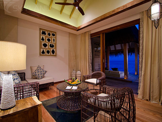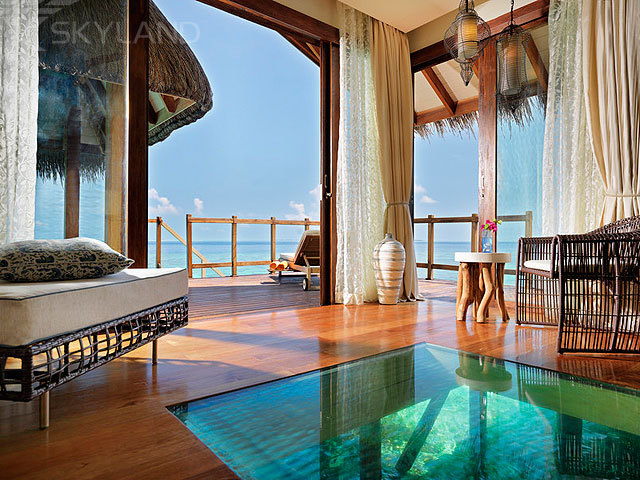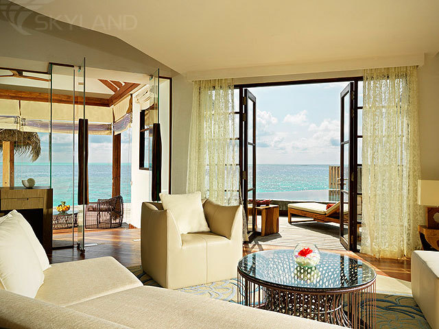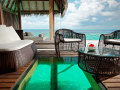 7 Ocean Suites With Pool (256 кв.м) – двухэтажные водные виллы с «бескрайним» бассейном и панорамным видом на Индийский океан. Комплекс вилл расположен на сваях в водах лагуны, куда доставляет традиционная лодка dhoni. На первом этаже виллы: просторная гостиная со стеклянной панелью в полу, телевизором с ЖК экраном (106,7 см), рабочим столом и выходом в гостиную зону открытого плана; открытая терраса с персональным бассейном (17 кв.м), лежаком и столовой зоной; балкон с видом на лагуну; гардеробная комната; ванная комната с мраморной ванной, душевой кабиной с «ливневым» душем и отдельным туалетом; терраса-солярий с лежаками, павильоном для массажа и романтических ужинов и спуском в воды лагуны. На втором этаже виллы: спальня с кроватью king-size (2 x2 м), рабочим столом и телевизором с ЖК экраном (106,7 см), гардероб, ванная комната с душевой кабиной с «ливневым» душем и отдельным туалетом. Максимальное размещение: 3 взрослых или 2 взрослых и 1 ребенок до 12 лет.
