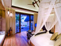 16 Water Villas with Pool Sunset (200 кв.м) – водные виллы с «бескрайним» бассейном, видом на закат и видом Индийский океан. На каждой вилле: спальня с кроватью king-size (2 x2 м), рабочим столом и телевизором с ЖК экраном (106,7 см), гостиная со стеклянной панелью в полу, телевизором с ЖК экраном (106,7 см), терраса с персональным бассейном (17 кв.м), лежаком и столовой зоной, гардероб, ванная комната с душевой кабиной с «ливневым» душем, мраморной ванной и отдельным туалетом; терраса-солярий с лежаками, павильоном для массажа и романтических ужинов и спуском в воды лагуны.
