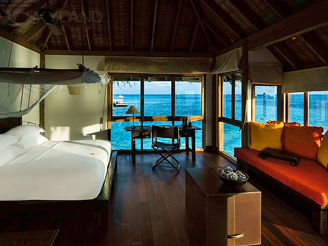 8 Soneva Gili Residences (250 кв.м) - надводные виллы соединенные с островом деревянными мостками, с отдельной спальней и гостиной с диваном, который может использоваться как дополнительная кровать.