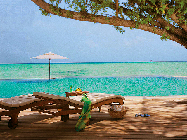 В 10 Deluxe Lagoon Villas на индивидуальной террасе есть небольшой бассейн с пресной водой и кушетка для отдыха.