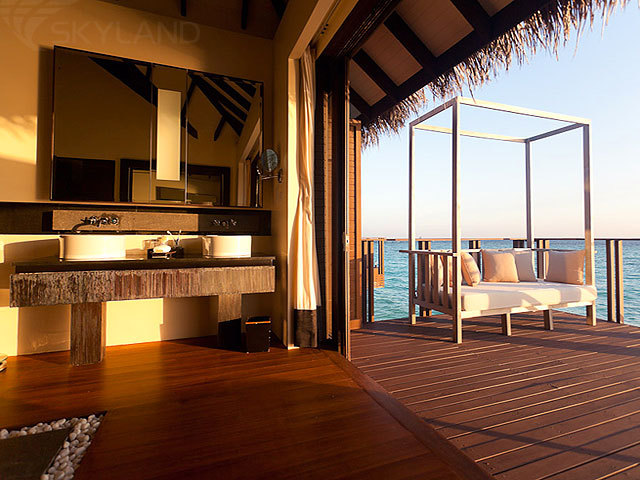 10 Deluxe Aqua Villas (186 кв.м) – стоящие на сваях в водах лагуны виллы, состоящие из фойе с гостиной зоной, спальней с гостиной зоной, просторной ванной комнатой с видом на океан, 2 раковинами, отдельно стоящей ванной и душевой кабиной («ливневый» душ), гардеробной зоной «для него» и «для нее» , тропического душа под открытым небом, открытой террасы с обеденной зоной, диванами для дневного отдыха, лежаками и спуском в воды лагуны. Максимальное размещение: 2 взрослых и 1 ребенок до 12 лет.