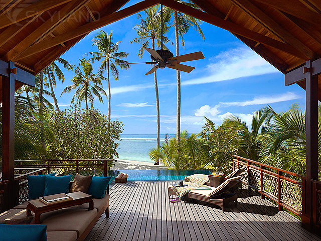 Beach Villas – стоящие на пляже виллы со спальней, отдельной гостиной, ванной комнатой с ванной, туалетом и душем под открытым небом, открытой террасой с зоной отдыха.