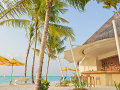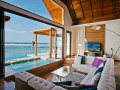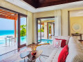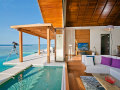2 Water Pavilions with Private Pool (255 кв.м) – стоящие на сваях в водах лагуны и соединенные с островом и друг другом деревянными мостками виллы, состоящие из спальни с кроватью king-size, гардеробом и гостиной зоной, ванной комнаты с глубокой ванной, душем под открытым небом и туалетом, гостиной со столовой зоной (стол на 4 персоны), просторной открытой террасы с зоной отдыха (софа), гостиной зоной, столиком для двоих, солярием с лежаками, персональным бассейном с джакузи, видом на Индийский океан и спуском в воды лагуны.