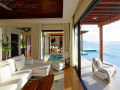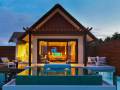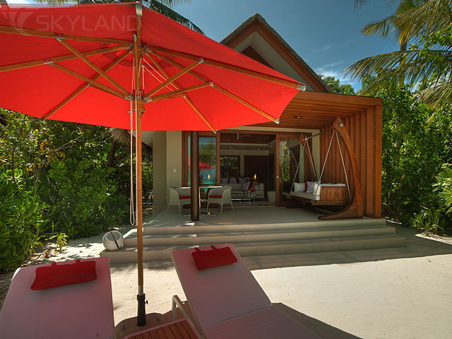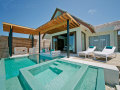 1 Two Bedroom Beach Pavilion with Pool (635 кв.м) - стоящая на пляже у вод лагуны роскошная вилла, состоящая из главной спальни с кроватью king-size, гардеробной, гостиной зоной, ванной комнатой открытого плана с раковиной, туалетом, глубокой ванной, душевой кабиной с функцией «ливневый душ», выходом в мини-садик с рукотворным водоемом и личному «водопаду» (душ под открытым небом) и на приватную террасу-солярий с лежаками; вторая спальня с 2 кроватями twin, гардеробной, ванной комнатой открытого плана с раковиной, туалетом, глубокой ванной, душевой кабиной с функцией «ливневый душ», выходом в мини-садик с рукотворным водоемом, к личному «водопаду» (душ под открытым небом) и на приватную террасу-солярий с лежаками; фойе, гостиной со столовой зоной (стол на 6 персон) и баром; просторной открытой террасы с зоной отдыха (диван-качели и 2 софы для дневного отдыха) и столовой зоной на 4 персоны, оборудованного оптоволоконной подсветкой индивидуального бассейна с джакузи, 2 террасами для загара и видом на пляж и Индийский океан.