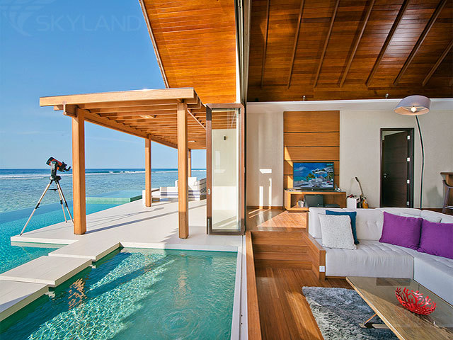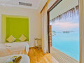 14 Deluxe Water Studios with Private Pool (190 кв.м) – стоящие на сваях в водах лагуны и соединенные с островом и друг другом деревянными мостками виллы, состоящие из спальни с кроватью king-size, гардеробом и гостиной зоной, ванной комнаты с глубокой ванной, душем под открытым небом и туалетом, открытой террасы с зоной отдыха (софа у бассейна), столиком для двоих, гостиной зоной, солярием с лежаками, персональным бассейном с джакузи, видом на Индийский океан и спуском в воды лагуны.