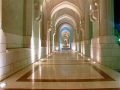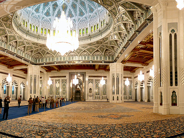 Эта грандиозная мечеть строилась на протяжении семи лет на личные средства султана Кабуса, и была открыта в мае 2001 года. Ее окружают 5 минаретов, самый большой из которых имеет высоту 91,5 м. Над главным зданием мечети, площадь которого составляет около 5, 5 тыс кв.м, на 50-метровой высоте возведен двойной купол, внутренняя оболочка которого покрыта позолоченной мозаикой, а внешняя – легкая ажурная. Пол главного зала покрывает уникальный персидский ковер размером – 70 х 60 метров, который весит 21 тонну! 58 его частей ткали 600 женщин в течение 4 лет, затем все эти части были соединены в один гигантский ковер. В узорах ковра можно насчитать 28 цветов, причем в окрашивании нитей использовались исключительно растительные ингредиенты. Главный зал мечети освещают 35 люстр; диаметр самой большой из них, изготовленной по специальному заказу в Австрии - 14 м. В ней сияют 1122 лампы, а весит люстра 8 тонн! Без сомненья, Большая Мечеть Султана Кабуса - самая яркая достопримечательность Маската.