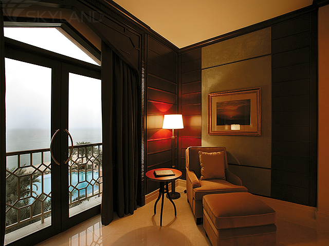12 Al Husn One Bedroom Suites (общая площадь 112 кв.м) – роскошные просторные номера с прекрасной гостиной, спальней и балконом с прекрасным видом на Оманский залив (16 кв.м). В номерах – телевизор с большим плоским экраном, а в ванной комнате – стеклянные раздвижные панели, сквозь которые можно любоваться морскими далями. Гостям этих номеров по запросу предоставляются услуги персонального дворецкого.