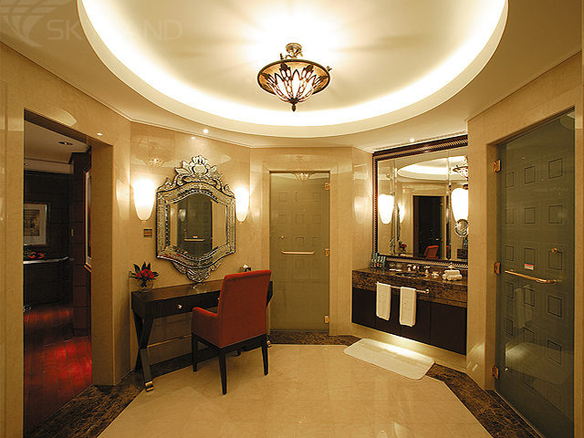 1 Jabreen/Royal Suite (общая площадь 500 кв.м) - огромный, самый роскошный в курортном комплексе, номер с просторной гостиной, столовой, спальней, а также огромной террасой с джакузи на свежем воздухе и панорамным видом на Оманский залив. В этот номер, изысканный декор которого навеян убранством знаменитого оманского замка Jabreen, гости поднимаются на персональном лифте. В гостиной – телевизор с большим плоским экраном, а в ванной комнате – стеклянные раздвижные панели, сквозь которые можно любоваться морскими далями, а также, помимо ванной душевой кабины, паровая баня. Гостям этих номеров по запросу предоставляются услуги персонального дворецкого.