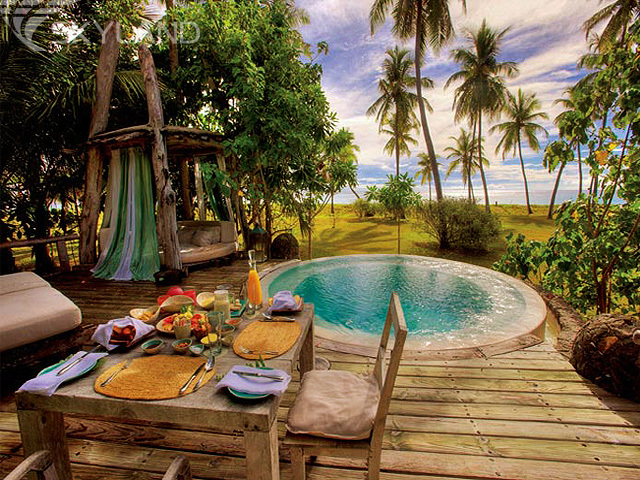 Все виллы полностью изолированы друг от друга и приподняты над землей на высоту около метра, чтобы гости могли наслаждаться освежающим океанским бризом. В каждой вилле с чарующим видом на океан есть свой частный бассейн с джакузи и крытая соломой беседка с кроватью под балдахином для принятия воздушных ванн на открытой террасе (200 кв. м), гостиная, кухня-столовая, большая ванная комната с мраморной ванной, душевой кабиной, отдельным туалетом и биде, душ под открытым небом, главная и дополнительная спальня.