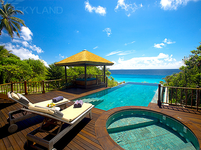 Private Pool Twin Residences (570-700 кв.м) – вилла с видом на океан и тропический сад, с двумя спальнями (одна с кроватью king-size, вторая с 2 отдельными кроватями), 3 ванными комнатами, каждая с ванной и душем на открытом воздухе, гостиная, терраса с обеденным павильоном, софой для дневного отдыха, персональным «бескрайним» бассейном и джакузи. Максимальное размещение – 4 взрослых и 2 детей.