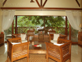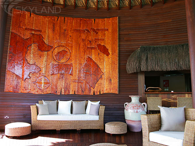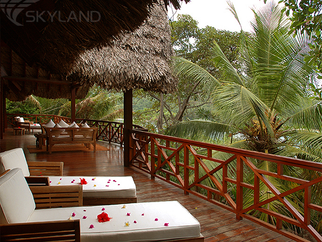 просторная терраса (85 м) с видом на океан и соседние острова, оборудованной лежаками зоной отдыха, гостиной зоной, обставленной 2 диванчиками, или 4 креслами, и журнальным столиком;
