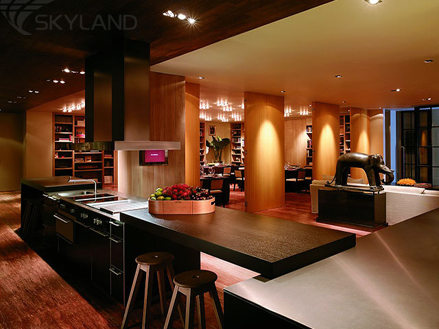 К услугам гостей ресторана: главный обеденный зал на 105 персон, сочетающем в себе зону гостиной, обеденные столики и 5 столов для «живых» кулинарных представлений, а также бар и 2 зала для частных ужинов и вечеринок с участием от 12 до 32 гостей.