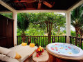 9 Spa Deluxe Garden View Rooms (общая площадь 77 кв.м) – просторные однокомнатные номера со спальней (52 кв.м) с кроватью king-size, гостиной зоной, ванной комнатой с ванной и душевой кабиной, и балконом (25 кв.м) с зоной отдыха, обеденным столиком, джакузи на открытом воздухе (со спа-средствами от SPA Cenvaree), и видом на сад. Дополнительно: CD/DVD-проигрыватель. Максимальное размещение: 2 взрослых и 1 ребенок.