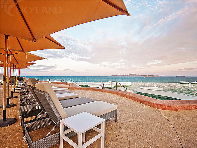 43 Grand Sea View Plus (около 39 кв.м) – просторные однокомнатные номера с видом на Сиамский залив и Коралловый остров (Ко Лан), оборудованным 2 шезлонгами балконом (около12 м), спальней с зоной отдыха, отделанной мрамором ванной комнатой, с ванной, душевой кабиной и двумя раковинами, и гостиной зоной с диваном и рабочим столом.