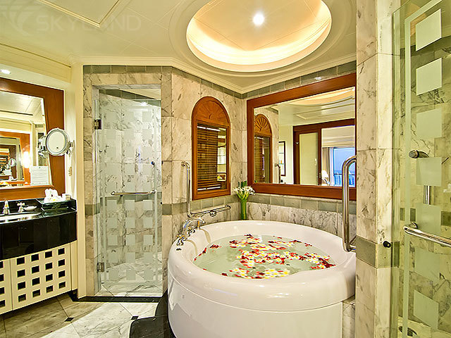 84 Royal Wing Suites – One Вedroom (55 кв.м) – после недавней реновации декор этих номеров обогатился яркими чертами современного стиля, сохранив при этом традиционно тайские элементы. Номер включает в себя элегантную спальню, переходящую в гостиную, просторный (15 кв.м) балкон, и роскошную мраморную ванную комнату с круглой ванной-джакузи и просторной душевой кабиной с ливневым душем.