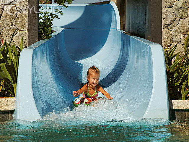 открытый бассейн с водопадом, водной горкой и баром у бассейна;