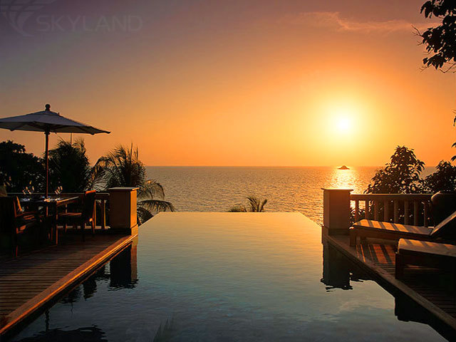 7 Ocean Front Pool Villas (общая площадь 240 кв.м) - расположенные на склоне холма, в 8 метрах над уровнем пляжа, виллы, состоящие из спальни (96 кв.м) с кроватью king-size или двумя кроватями twin, гостиной зоны, ванной комнаты, душа на открытом воздухе, террасы с 10-метровым бассейном, обеденной зоной, зоной отдыха и видом на Андаманское море. Возможно 1 дополнительное спальное место. Максимальное размещение: 3 взрослых или 2 взрослых и 2 ребенка.