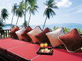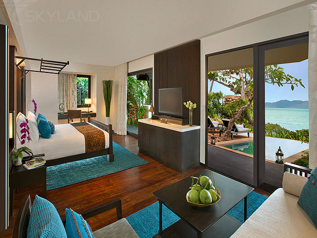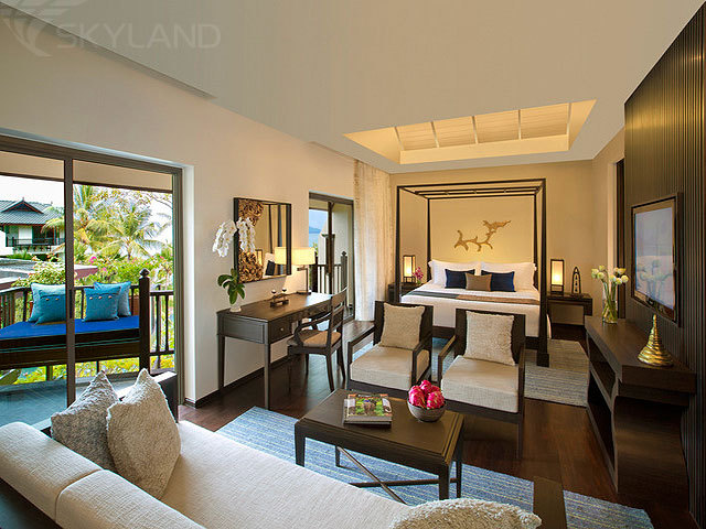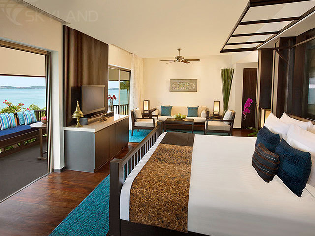 4 Royal Sea View Suites (80 кв.м) - расположенные на 2 и 3 этажах просторные номера с потрясающим видом на тропические сады и Сиамский залив. Номера состоят из изящной спальни с кроватью king-size под балдахином, выделенной гостиной зоны, просторной ванной комнаты с ванной-терраццо для двоих, душевой кабиной (ливневый душ), 2 раковинами и 2 шкафами (для нее и для него), а также расположенного по периметру номера просторного балкона с зоной отдыха и удобным диваном. В номерах дополнительно: регулируемый потолочный вентилятор, кофеварка эспрессо.