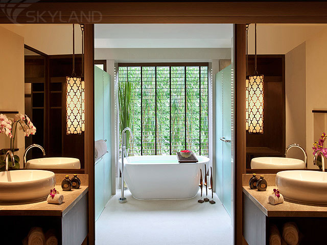 ванная комната с душевой кабиной с функцией «ливневый душ» (в номерах Premier Garden, Deluxe Garden и Deluxe Sea View Rooms), или с ванной и душевой кабиной (в остальных категориях номеров).