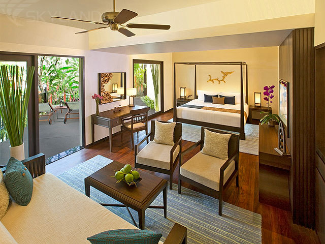 22 Junior Garden View Suites (44 кв.м) - расположенные на 1 этаже просторные однокомнатные номера с прекрасным видом на тропические сады. Номера состоят из спальни с кроватью king-size или 2 кроватями twin, и зоной отдыха с диваном и столиком, ванной комнаты с глубокой ванной, душевой кабиной (ливневый душ), 2 раковинами и 2 шкафами (для нее и для него), а также открытой террасы с зоной отдыха и выходом в чудесный тропический сад.