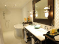 ванная комната с 2 раковинами, отдельным туалетом, ванной и душем;
