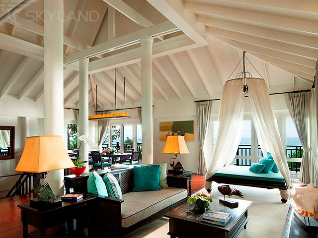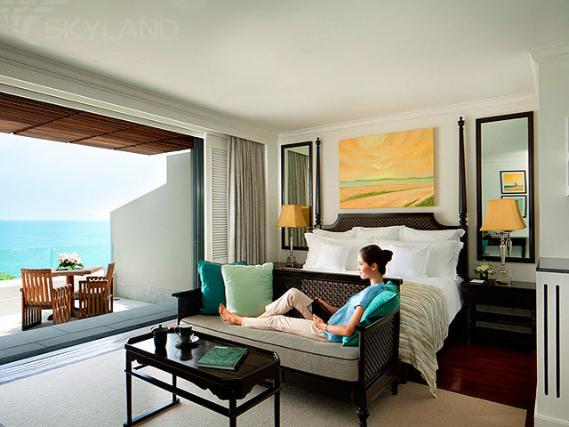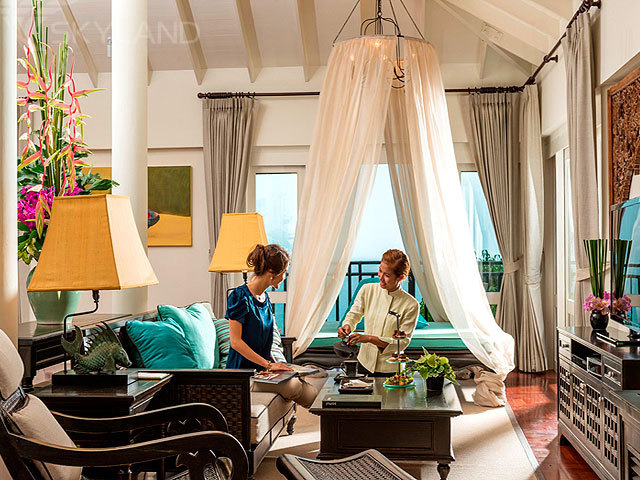 Ocean View Junior Suites (120 кв.м) – расположенные в главном здании или на верхних этажах окруженных тропическим садом 2-этажных вилл номера с романтической атмосферой и видом на Сиамский залив, состоящие из спальни с размещенной между 4 столбами кроватью king-size, укрытой роскошными тканями, просторной гостиной и рабочей зоной, ванной комнаты открытого плана с 2 раковинами, отдельным туалетом, глубокой дизайнерской ванной и душевой кабиной, туалетным столиком и гардеробной, а также просторной террасы с софой для дневного отдыха и гостиной зоной с диваном, креслами и журнальным столиком.