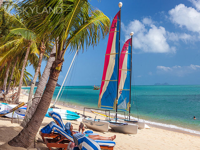 Собственный оборудованный гамаками и лежаками песчаный пляж протяженностью 300 м. на территории обширного пляжа Маенам (Mae Nam Beach). На пляже предлагается обслуживание “beach butler service”, включающее бесплатно 2 пляжных полотенца на человека, бутилированная минеральная вода, фрукты и мороженое 2 раза в день.