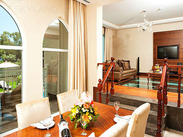 1 Superior Pool Grand Suite (150 кв.м, включая террасу) – расположенный в 2-этажном коттедже номер с видом на море и прямым выходом к бассейну, гостиной, 2 спальнями (одна - с дверью, вторая - без двери, в обеих - ванная комната с джакузи и душевой кабиной). И в спальнях, и в гостиной есть телевизор и мини-бар. Дополнительно – DVD-проигрыватель и VIP-сервис. Максимальное размещение – 4 человека.