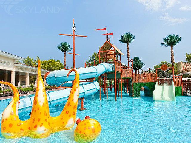Aquapark - гигантский аквапарк, разместившийся на площади 22 тыс. кв.м, где есть 27 водных горок, 16 из них (включая водные горки «Камикадзе», «Рафтинг», «Черная дыра», «Мульти спуск») предназначены для взрослых. Еще 13 водных горок, 7 из которых расположены в тематическом бассейне «Пиратский Корабль», а 6 - в водном комплексе «Мир Животных», предназначены исключительно для маленьких гостей. В дополнение к водным горкам, как альтернатива детскому пляжу, есть большой детский бассейн – одно из самых любимых у детей мест в аквапарке, с тремя водными горками в форме в слона, змеи и кролика, фонтаном «Дельфин», фигурками слона, лягушки, птиц, грибов, а также душем в форме клоуна. А для взрослых также есть водный массаж, тропический душ и джакузи. У бассейнов - зонтики, шезлонги, лежаки бесплатно.