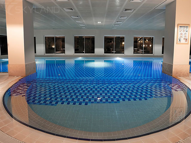 основной открытый бассейн, большой открытый бассейн с 4 водными горками, а также крытый бассейн и открытый детский бассейн;
